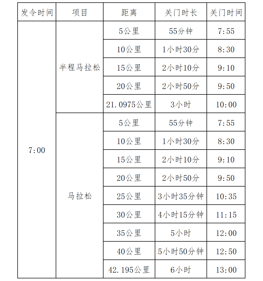 6.赛时分段关门与时间:为了保证参赛选手赛时安全,限时对社会交通进行滚动封闭。比赛路线将按公里点位置设置关门时间,分路段、分时段对社会交通进行临时管制。关门时间按自然时间计算,关门时间到后,相应公里点的计时毯停止工作,相应路段将恢复社会交通。未跑到相应公里点的选手须退出赛道,以免发生危险。退出赛道的选手可搭乘沿途的收容车抵达终点或自行选乘公共交通离开。如遇突发紧急情况和不可抗力事件,组委会有权提前关门或停止比赛。