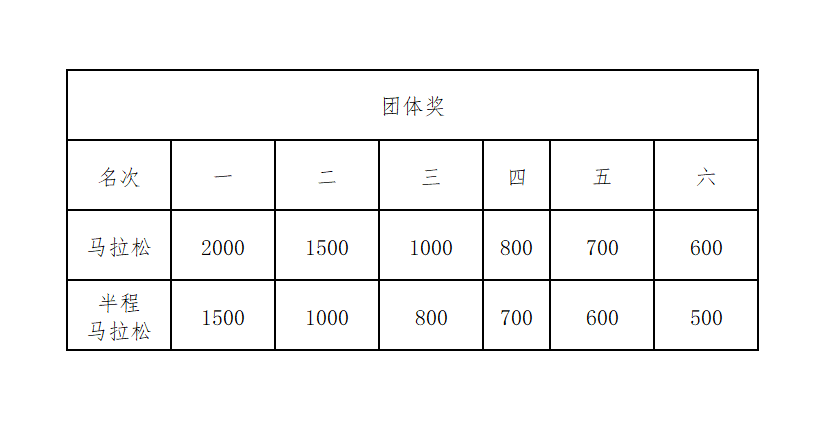 为激发全国各地跑协(团)竞技热情、展现良好的精神风貌,本次赛事特别设立马拉松和半程马拉松项目团体奖。各参赛团队组织4男1女选手参赛(报名请联系团体赛负责人朱女士18679371116),赛前对符合要求的团队进行公示,最终按有效净成绩的平均成绩排名,取前 6 名团队颁发奖金及荣誉证书(具体奖励如下表,单位:人民币)